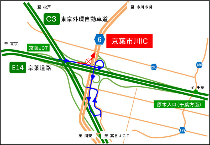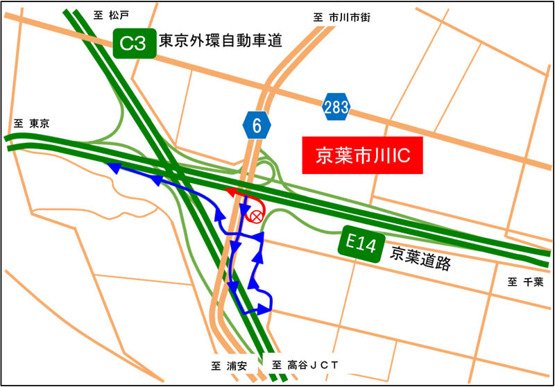 閉鎖①京葉道路 京葉市川IC(市川市街から東京方面への)入口ランプ閉鎖②京葉道路 京葉市川IC(千葉方面への)入口ランプ閉鎖③京葉道路 京葉市川IC(東京方面から市川市街への)出口ランプ - 各路線に付しているE14等の表示は、高速道路等の路線番号(ナンバリング)を示しています。