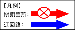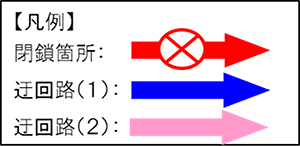 青色矢印の通り、迂回した場合、所要時間は約4分(通常約1分)かかる見込みです。