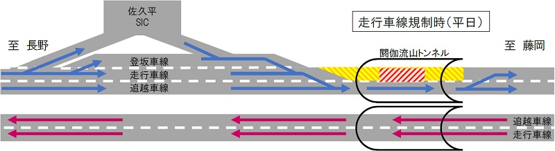 - 土曜日および日曜日には上り線 佐久平SIC前後において登坂車線規制を行うため、現状の片側3車線から2車線へ減少します。走行する際は規制速度を遵守し、車間距離を確保して追突事故などには十分注意をお願いします。また、佐久平SICから本線に合流する車両がありますので、前方に十分注意して走行をお願いします。
