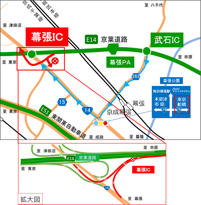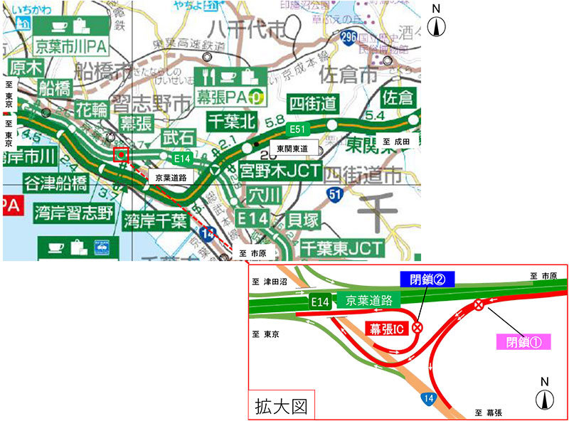 閉鎖①京葉道路 上り線 幕張IC(幕張・津田沼方面への)出口ランプ閉鎖②京葉道路 幕張IC(津田沼方面から東京方面への)入口ランプ - 各路線に付しているE14等の表示は、高速道路等の路線番号(ナンバリング)を示しています。