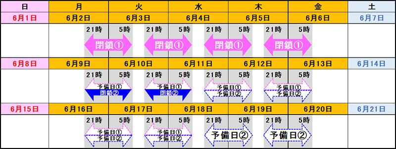 閉鎖① 実施日:令和7年6月2日(月)~5日(木) 予備日:令和7年6月9日(月)~12日(木)、16日(月)~17日(火) |