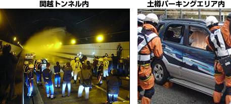 (1)関越トンネル下り線内・・・避難連絡坑による現場急行訓練、水噴霧・消防車による消火訓練、救急車による救出訓練、避難坑からの避難訓練