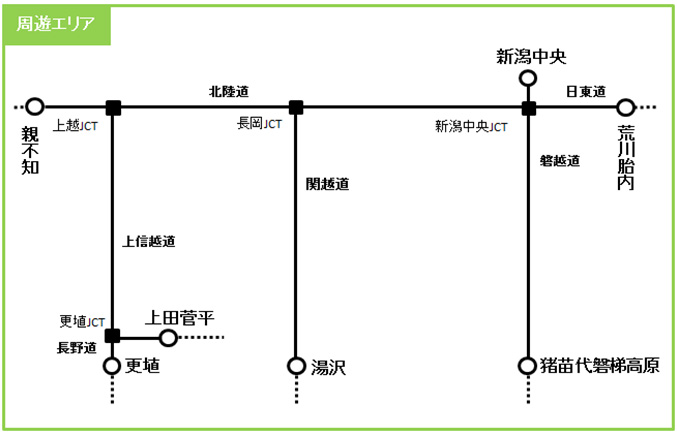 周遊エリア内(新潟県内、長野県北信濃地域、福島県会津地域)にある全59箇所のインターチェンジ(IC)について、お申し込みの際に選択された期間、乗り放題となります。