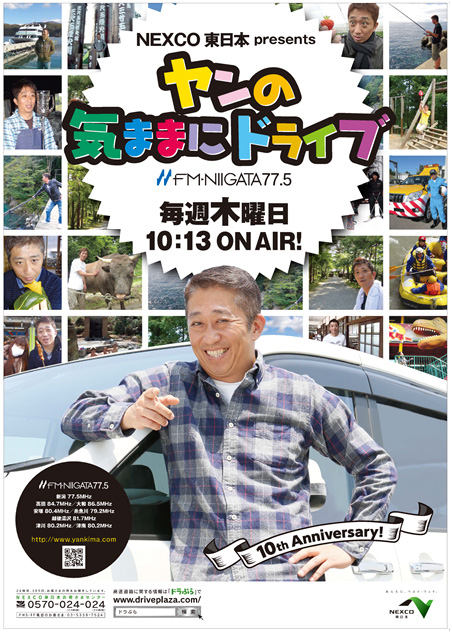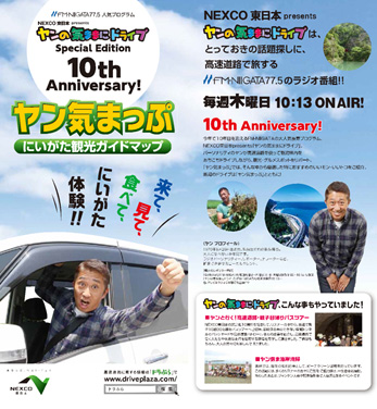 NEXCO東日本新潟支社(新潟市中央区)は、FM新潟で毎週木曜日に好評放送中の一社提供番組「NEXCO東日本presents ヤンの気ままにドライブ」(通称:ヤン気ま)が、今月で放送開始から10周年を迎えることを記念し、明日10月6日(木)午前9時から2時間の特別番組を放送します。