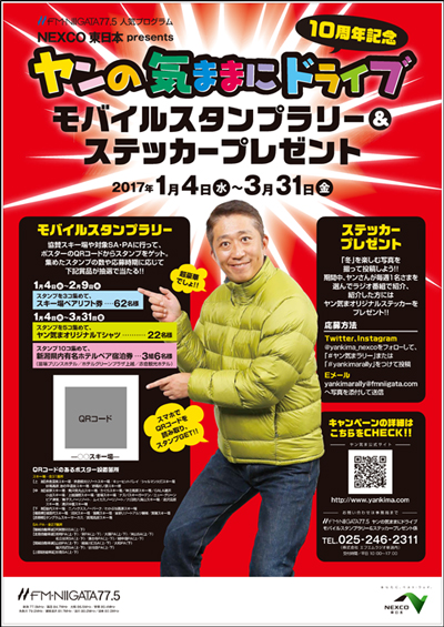 NEXCO東日本新潟支社(新潟市中央区)は、FM新潟で毎週木曜日に好評放送中の「NEXCO東日本presents ヤンの気ままにドライブ(以下、「ヤン気ま」)」放送開始10周年を記念して、1月4日(水)から「ヤンの気ままにドライブ モバイルスタンプラリー&ステッカープレゼント」を実施します。