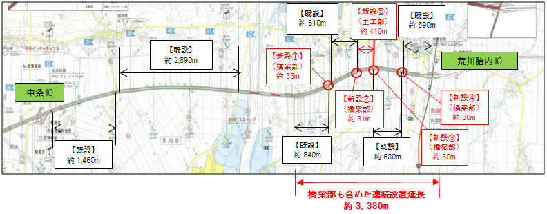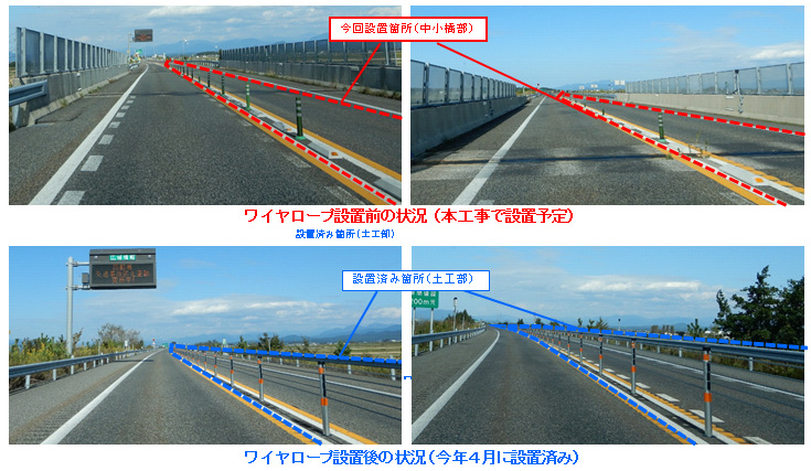 日本海東北自動車道 中条IC~荒川胎内IC間は、今年4月に暫定二車線区間(土工部)の一部に交通安全対策としてワイヤロープを試行設置していますが、今回の工事で同区間の中小橋(橋長50m未満の橋)の一部にもワイヤロープを試行設置します。また、中小橋部へのワイヤロープ設置工事に併せて橋間の土工部(ワイヤロープ未設置区間)にもワイヤロープを設置し、ワイヤロープ区間を延長して交通安全対策を強化します。