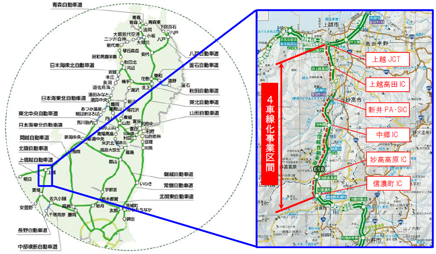 - 信濃町IC~妙高高原IC間(5.1kmのうち3.2km)*一部区間4車線化