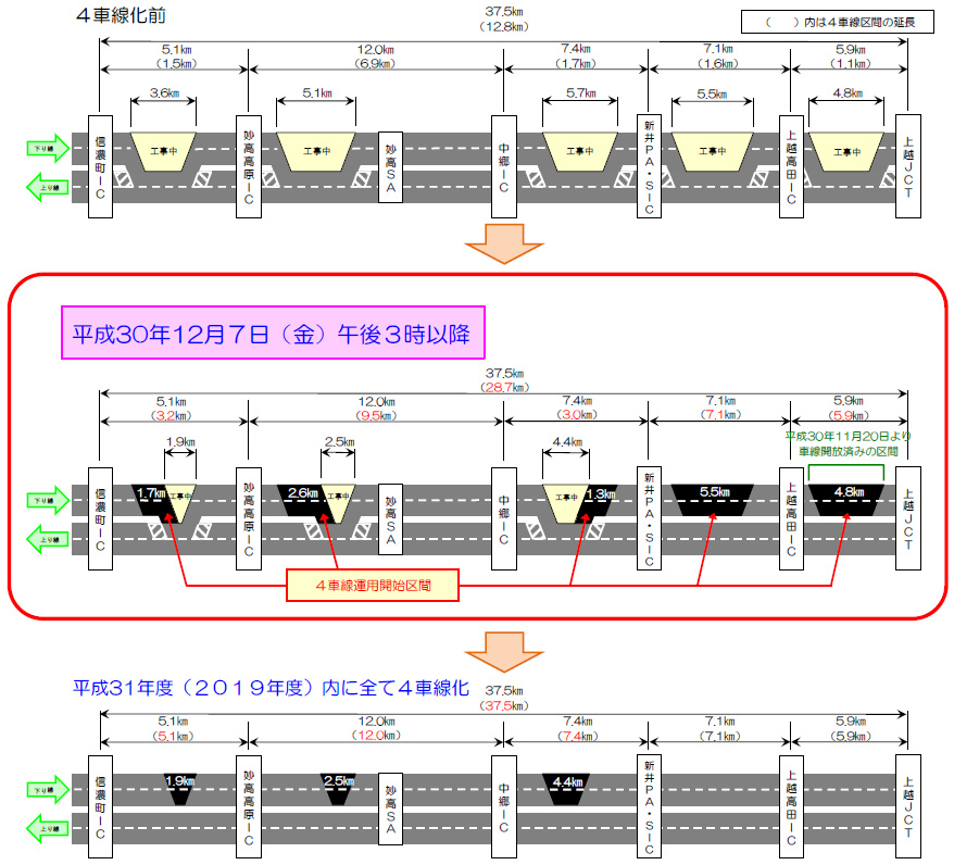 - 妙高高原IC~中郷IC間(12.0kmのうち9.5km)*一部区間4車線化