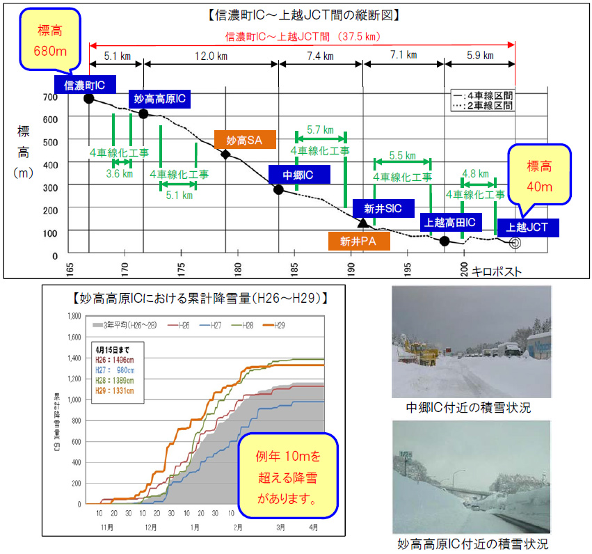 - この区間は日本有数の豪雪地帯を通過しているうえに、日本海側の標高40m(上越JCT付近)から長野県側の標高680m(信濃町IC付近)まで標高が上がる、急勾配の区間となっています。