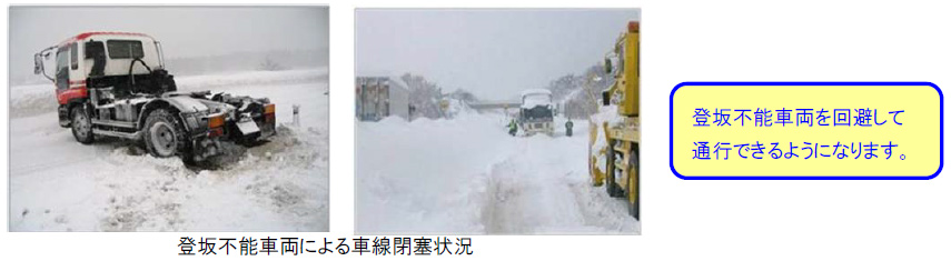 - 雪などにより、大型車が登坂不能となって車線を塞ぎ、後続の車両が滞留してしまう事象が、過去10年間(H19年度~H29年度)で55回発生していましたが、4車線化によって、こうした場合でも登坂不能車両を回避して通行できるようになります。