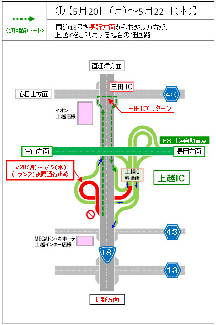 | 国道18号利用(迂回路) | 国道18号→三田IC(Uターン) →上越IC料金所 | 国道18号→寺IC(Uターン) →上越IC料金所 |
