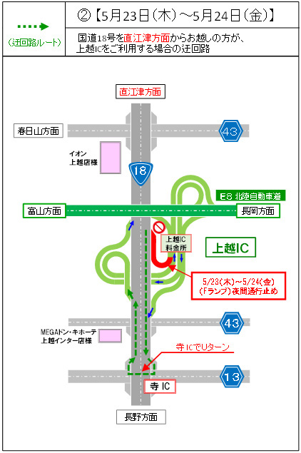 | 夜間通行止め箇所 | 【1】長野方面からの入口閉鎖時 | 【2】直江津方面からの入口閉鎖時 |
