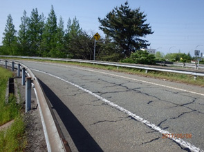 北陸自動車道 上越ICのランプ部(高速道路と一般道のアクセス部)において損傷した路面の補修を行います。