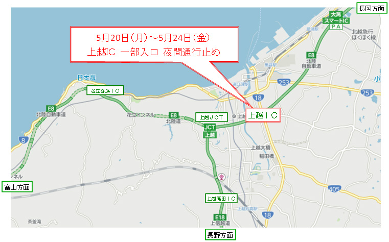 【E8】北陸自動車道 上越IC 一部入口 夜間閉鎖のお知らせ