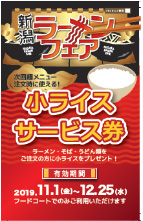 対象メニューをご注文のお客さまに、次回以降、麺メニュー(ラーメン・そば・うどん類)をご注文の際にご利用できる小ライスサービス券を1枚プレゼントします。
