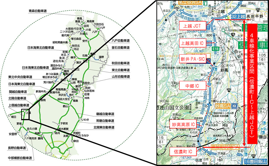 これにより、上信越自動車道は、藤岡JCT(群馬県藤岡市)から上越JCT(新潟県上越市)の全線(約203km)が4車線となります。