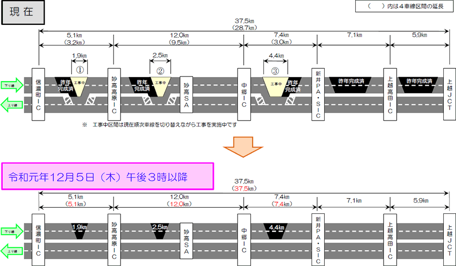 NEXCO東日本新潟支社(新潟市中央区)は、E18上信越自動車道 信濃町IC~上越JCT間(37.5km)において進めてまいりました4車線化工事について、昨年12月に同区間の約8割にあたる28.7kmを4車線とし、残る約2割の8.8kmについて令和元年度内の完成を目指して工事を進めてまいりましたが、12月5日(木)午後3時頃から4車線運用を開始できる見込みとなりました。これにより上信越自動車道は、藤岡JCT(群馬県藤岡市)~上越JCT(新潟県上越市)の全線(約203km)が4車線となります。