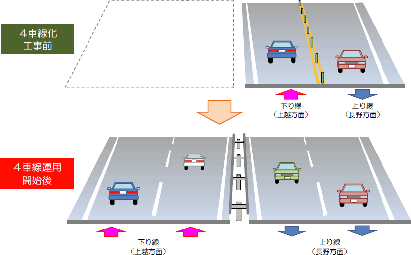 - 4車線運用開始日時は、天候等により前後する場合がございますので、ご了承ください。
