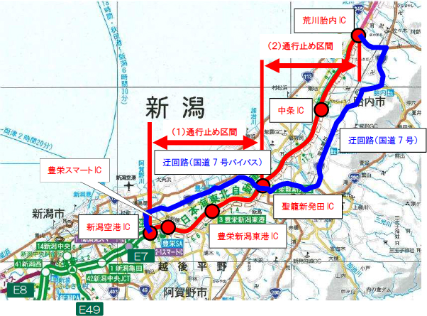 - (1)通行止め区間(新潟空港IC~聖籠新発田IC)の通行止めに伴う乗継料金調整については、【別紙2】【PDF:82KB】 をご確認下さい。