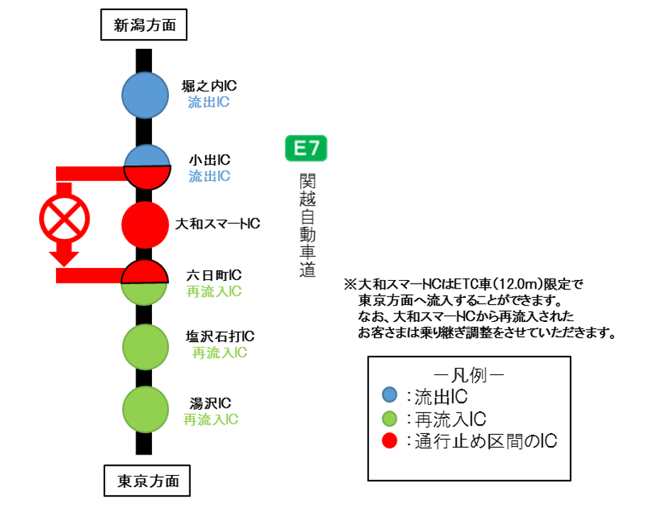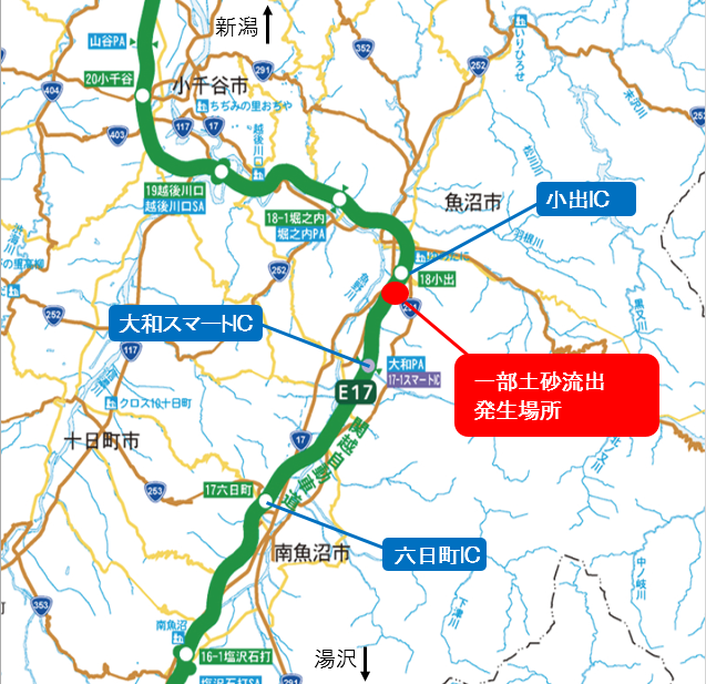 NEXCO東日本新潟支社(新潟市中央区)が管理する、 関越自動車道 小出(こいで)インターチェンジ(以下「IC」)~六日町(むいかまち)IC間(上り線)におきまして、災害通行止めを実施しています。なお、閉鎖していました大和(やまと)スマートIC(上り線)は、ETC車限定(12.0m以下)で利用を再開しています。