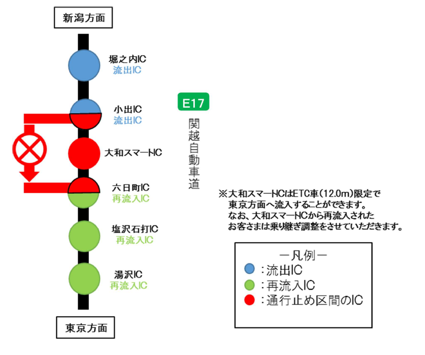 NEXCO東日本新潟支社(新潟市中央区)が管理する、キャプチャ3.PNG関越自動車道 小出(こいで)インターチェンジ(以下「IC」)~六日町(むいかまち)IC間(上り線)におきまして、災害通行止めを実施しています。国道17号等での迂回をお願いします。