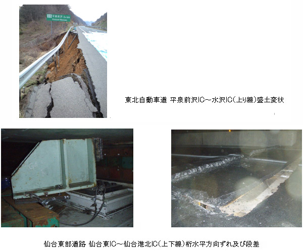 また、これら44箇所のうち、東北自動車道平泉前沢IC~水沢IC間(上り線)の盛土構造箇所において、盛土変状(道路路肩部の盛土が高さ約20m、長さ約30mにわたって崩れ)が生じており、仙台東部道路仙台東IC~仙台港北IC間(上下線)の橋梁部においては、橋桁が水平方向に5cmほどずれ、ジョイント部の路面に段差が生じています。