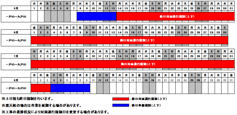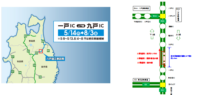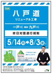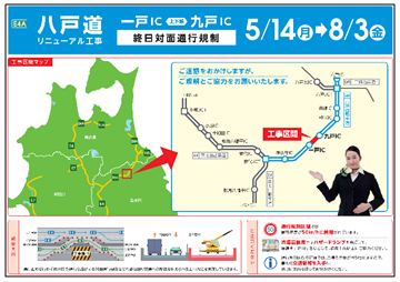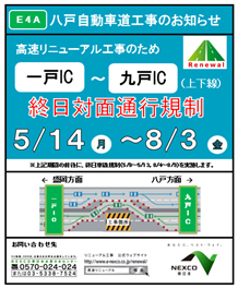 NEXCO東日本東北支社八戸管理事務所(青森県八戸市)は、E4A八戸自動車道 一戸インターチェンジ(IC)~九戸IC間(上下線)において、老朽化した橋りょうのリニューアル工事等に伴う終日対面通行規制を5月14日(月)から実施させていただきます。