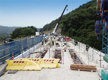 高速道路ネットワーク機能を長期にわたって健全に保つため、老朽化した楢山橋のコンクリート床版を補修します。また、そのほか滝野橋(たきのばし)他5橋の床版防水工事、舗装補修工事、折爪(おりつめ)トンネル補強工事、道路保全工事等についてもあわせて実施します。