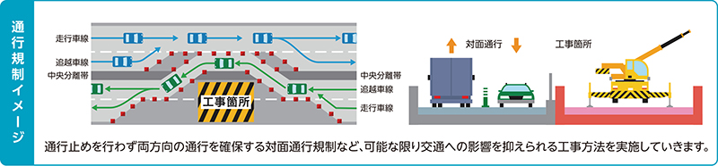 また、対面通行規制区間では走行車線や路肩は狭くなっているため、走行する際は規制速度を遵守し、車間距離を確保して追突事故などには十分注意をお願いします。また、対面通行規制区間の前後では大きく車線が切り替わりますので、現地の案内看板などに従って通行をお願いします。