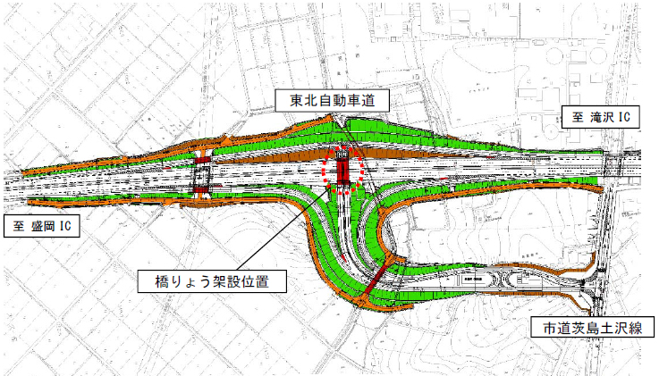 東北自動車道(盛岡IC~滝沢IC間)において、滝沢中央スマートIC建設に伴う橋りょう架設工事を行います。