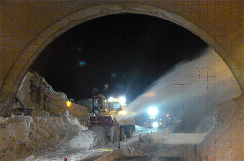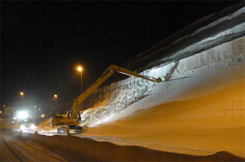 トンネル坑口や斜面に堆積した雪の除雪作業を行います。