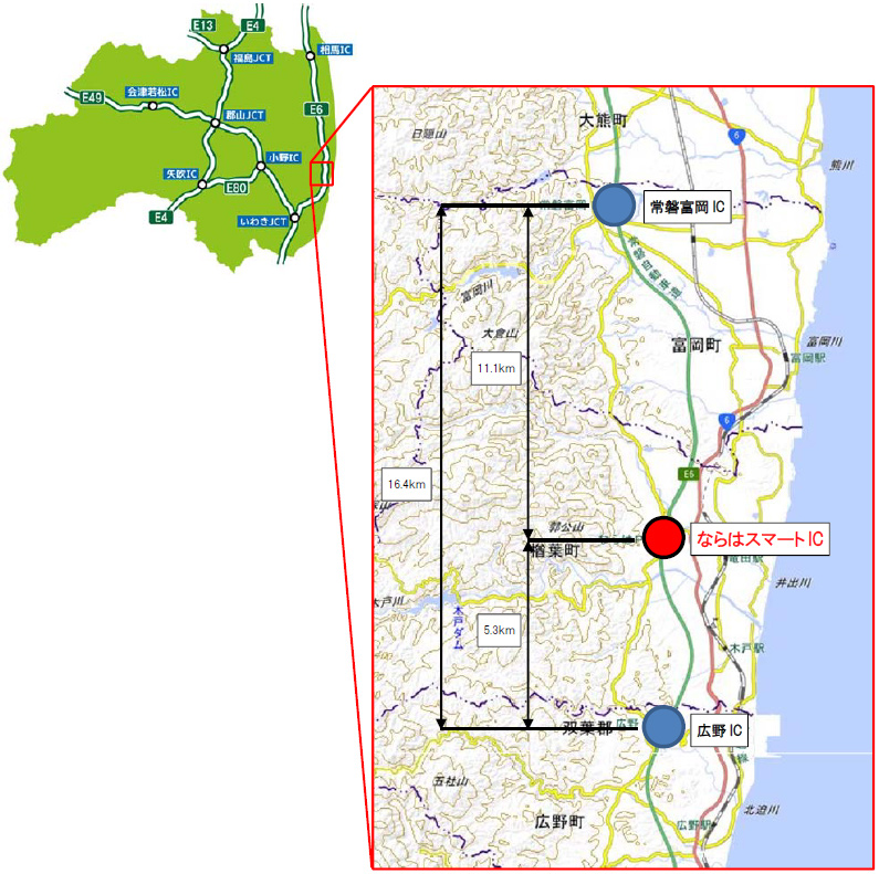 - 常磐自動車道 ならはスマートICは、広野ICから5.3km北側に、常磐富岡ICから11.1km南側に位置し、休憩施設(ならはパーキングエリア)により連結されます。