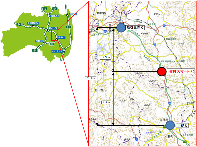 磐越自動車道 田村スマートICは、小野ICから9.5km、船引三春ICから11.0kmにおいて本線直結型により連結されます。
