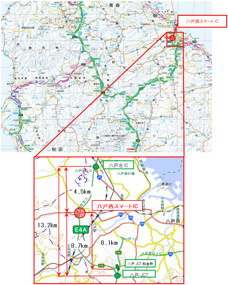 - 八戸自動車道 八戸西スマートICは、八戸JCTから8.7km、八戸北ICから4.5kmの市西部に位置し、本線直結型により連結されます。