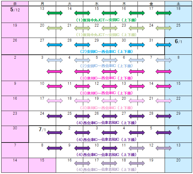 | 区間 | (1)新潟中央JCT~安田IC間 | (2)安田IC~西会津IC間 |