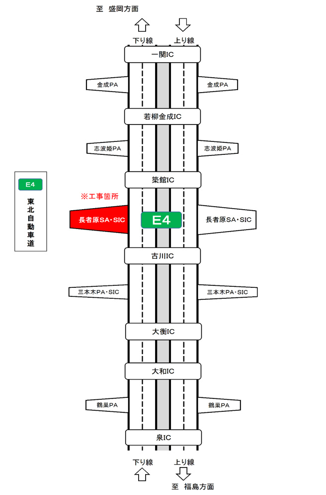 NEXCO東日本仙台管理事務所(宮城県仙台市)は、E4東北自動車道 長者原サービスエリア(SA)(下り線)において、休憩施設と駐車場との段差を解消するバリアフリー化工事のため、下記のとおり昼夜間連続で工事を実施します。
