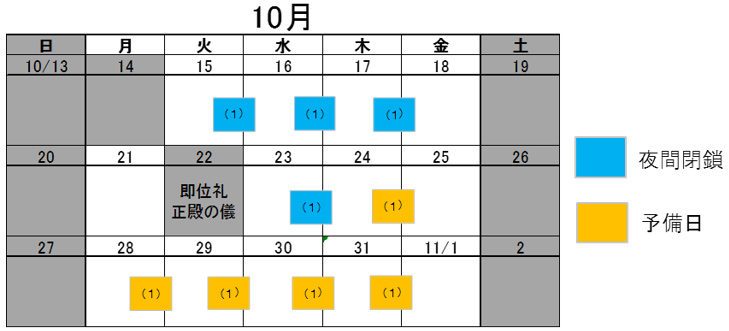 (1)令和元年10月15日(火)~17日(木)、23日(水) 21時~翌6時 4夜間