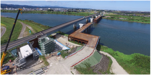 一級河川阿武隈川上を通過する阿武隈大橋は、河川内での橋脚工事を行うため、ニューマチックケーソン工法を採用し、橋脚工事を完了しています。