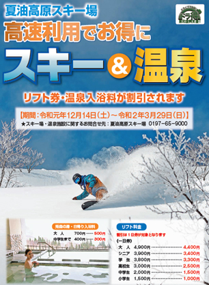 NEXCO東日本東北支社(仙台市青葉区)と(株)北日本リゾート(岩手県北上市)は、高速道路をご利用のお客さまに、「夏油高原スキー場」と「げとう高原温泉 兎森(うさぎもり)の湯」をお得に楽しんでいただけるよう、リフト券や温泉入浴料等が割引になるキャンペーンを下記のとおり実施します。