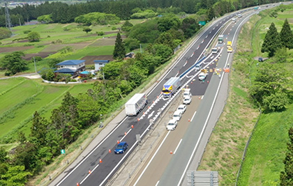 - 工事区間は約15kmにわたって終日対面通行規制となります。渋滞発生は予測されておりませんが、当該区間をご利用される場合は、安全運転に努めていただきますとともに、ご利用の際には時間に余裕をもってお出かけくださいますようお願いします。