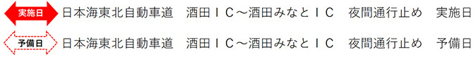 NEXCO東日本鶴岡管理事務所(山形県鶴岡市)は、暫定2車線区間(片側1車線)のE7日本海東北自動車道 酒田(さかた)インターチェンジ(IC)から酒田みなと(さかたみなと)ICにおいて、舗装補修工事等のため、下記のとおり夜間通行止めを実施します。