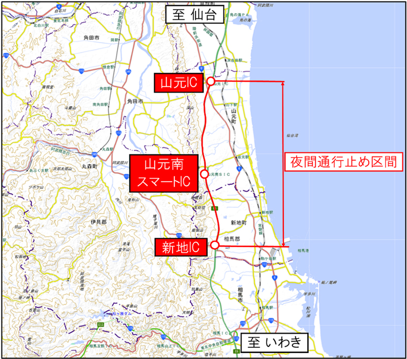 NEXCO東日本 仙台東管理事務所(宮城県仙台市)では、E6常磐自動車道(以下「常磐道」)上下線 新地インターチェンジ(以下「IC」)から山元ICにて舗装補修工事等を行うため、夜間通行止めを実施します。