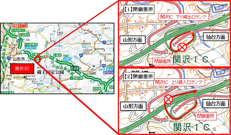 NEXCO東日本山形管理事務所(山形県山形市)では、E48山形自動車道 関沢インターチェンジ(以下「IC」)の上り線入口ランプ、下り線出口ランプにおいて、舗装補修工事および床版補修工事のため、終日閉鎖を実施します。