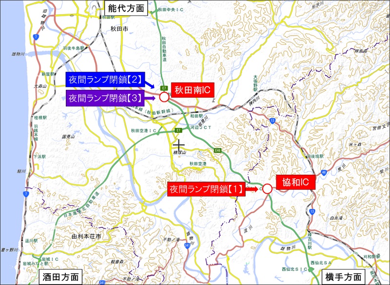 NEXCO東日本 秋田管理事務所(秋田県秋田市)では、E46秋田自動車道(以下「秋田道」)協和インターチェンジ(以下「IC」)、E7秋田道 秋田南ICにおいて、舗装補修工事を行うため、夜間ランプ閉鎖を実施します。