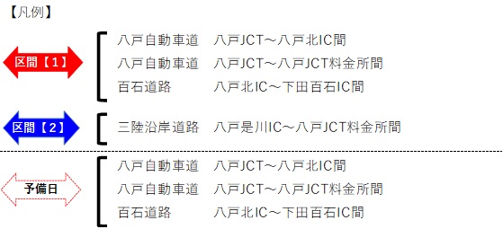 • 区間【1】の通行止め実施の際は、三陸沿岸道路 八戸是川ICから八戸自動車道を経由して盛岡方面へは通行できます。