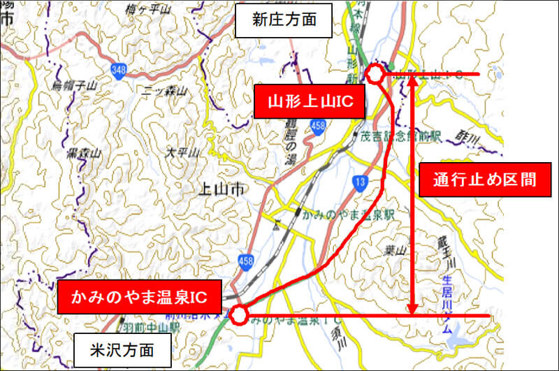 - 通行止め区間①:東北中央道 上下線 かみのやま温泉IC~山形上山IC