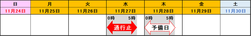 実施日:令和6年11月19日(火)~22日(金)各日夜20時~翌朝6時 土日祝日を除く予備日:令和6年11月25日(月)各日夜20時~翌朝6時