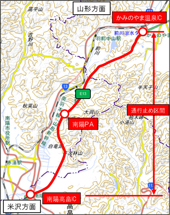 NEXCO東日本 山形管理事務所(山形県山形市)では、E13東北中央自動車道(以下「東北中央道」)上下線 南陽高畠インターチェンジ(以下「IC」)からかみのやま温泉ICにて舗装補修工事等を行うため、夜間通行止めを実施します。