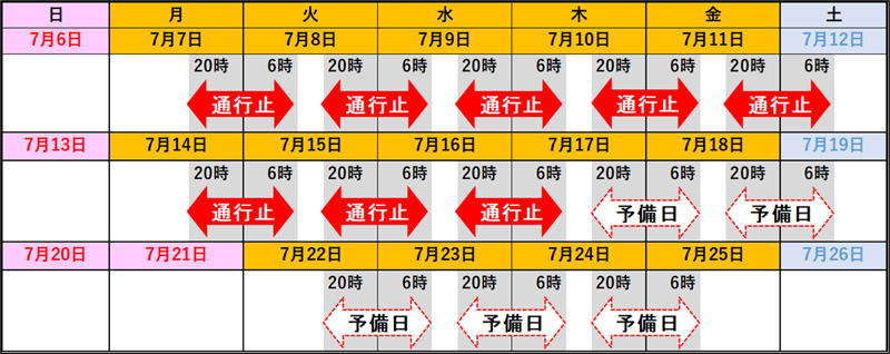 実施日:令和7年7月7日(月)~7月16日(水)各日夜20時~翌朝6時 土日祝日除く予備日:令和7年7月17日(木)~7月24日(木)各日夜20時~翌朝6時 土日祝日除く