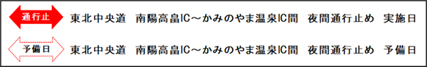 東北中央道 上下線 南陽PA 夜20時~翌朝6時 - 荒天時は、予備日に順延します。